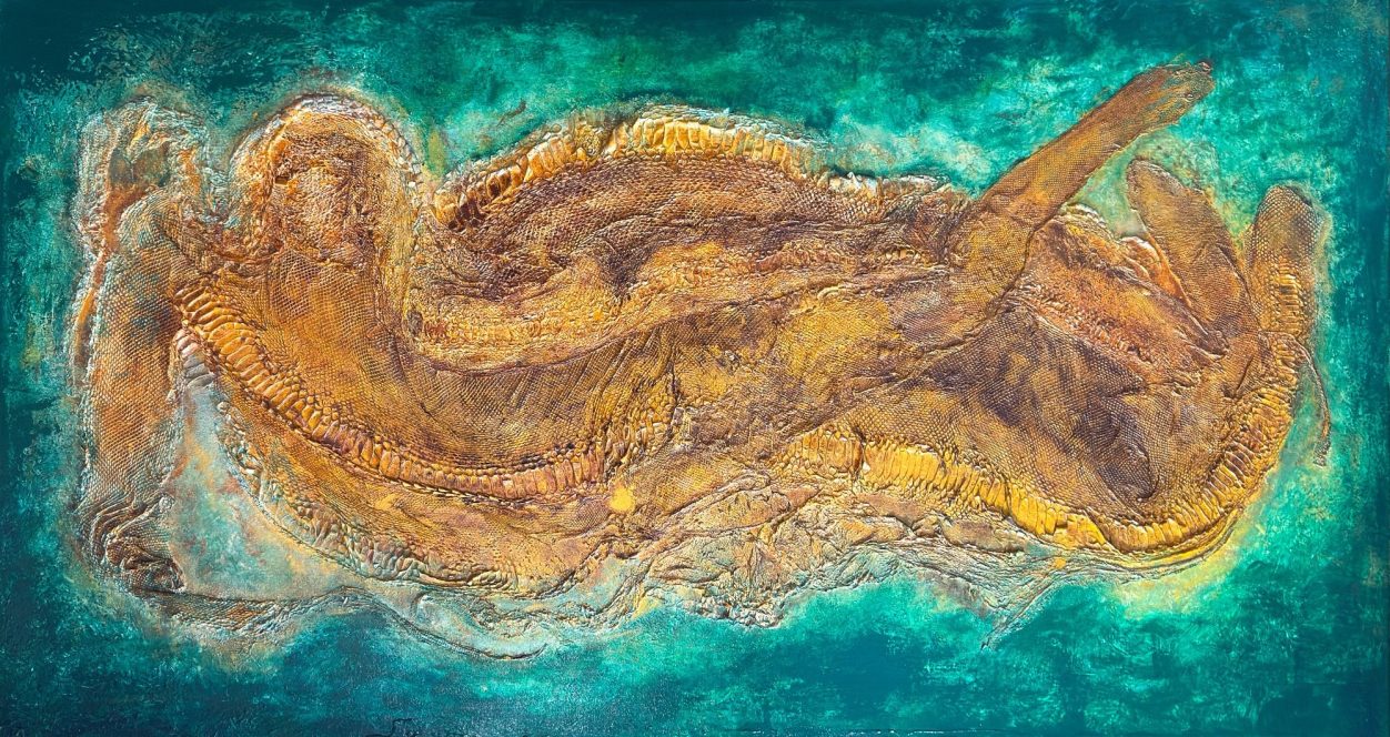 Acryl und abgeworfene Schlangenhaut auf Leinwand