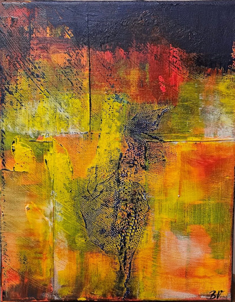 Acryl und abgeworfene Schlangenhaut auf Leinwand